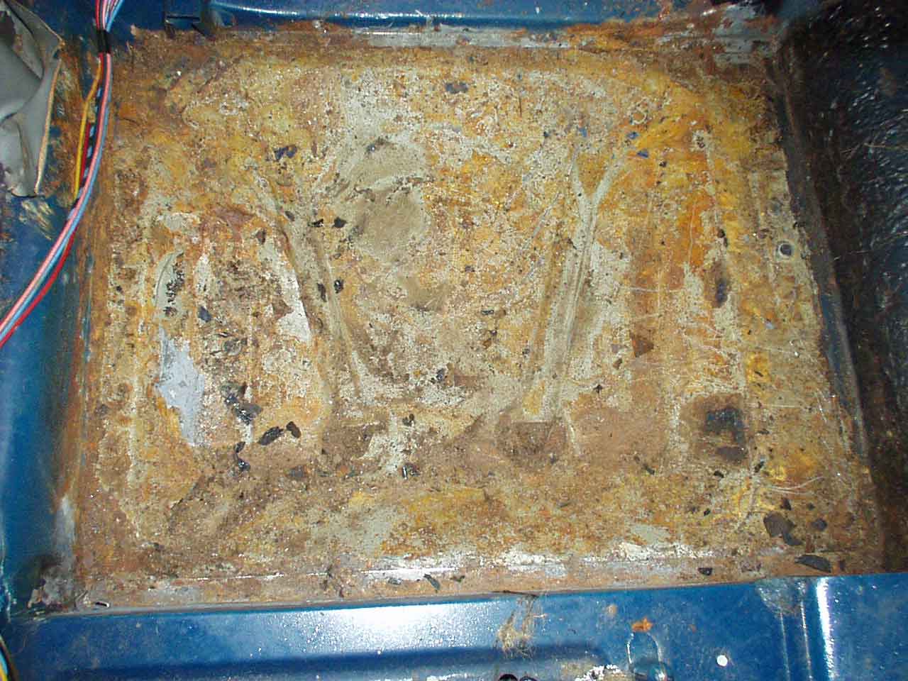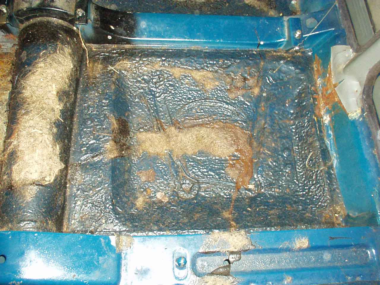 Ich möchte mir jetzt den Karosserieboden ansehen. Wer weiß, vielleicht gibt es hier hässliche Überraschungen. Die Kunststoffmatten sind schnell abgehoben, darunter befinden sich Filzmatten, die teilweise reichlich feucht sind. Mir schwant schon Böses. Ich reiße sie also heraus, einige zerfallen bei dieser Aktion in einzelne Atome, andere bleiben vollkommen intakt. Unter diesen Matten befindet sich auf dem Blech Dämmmaterial, das teilweise eingerissen ist. Also weg damit. Hier zeigt sich Flugrost.
