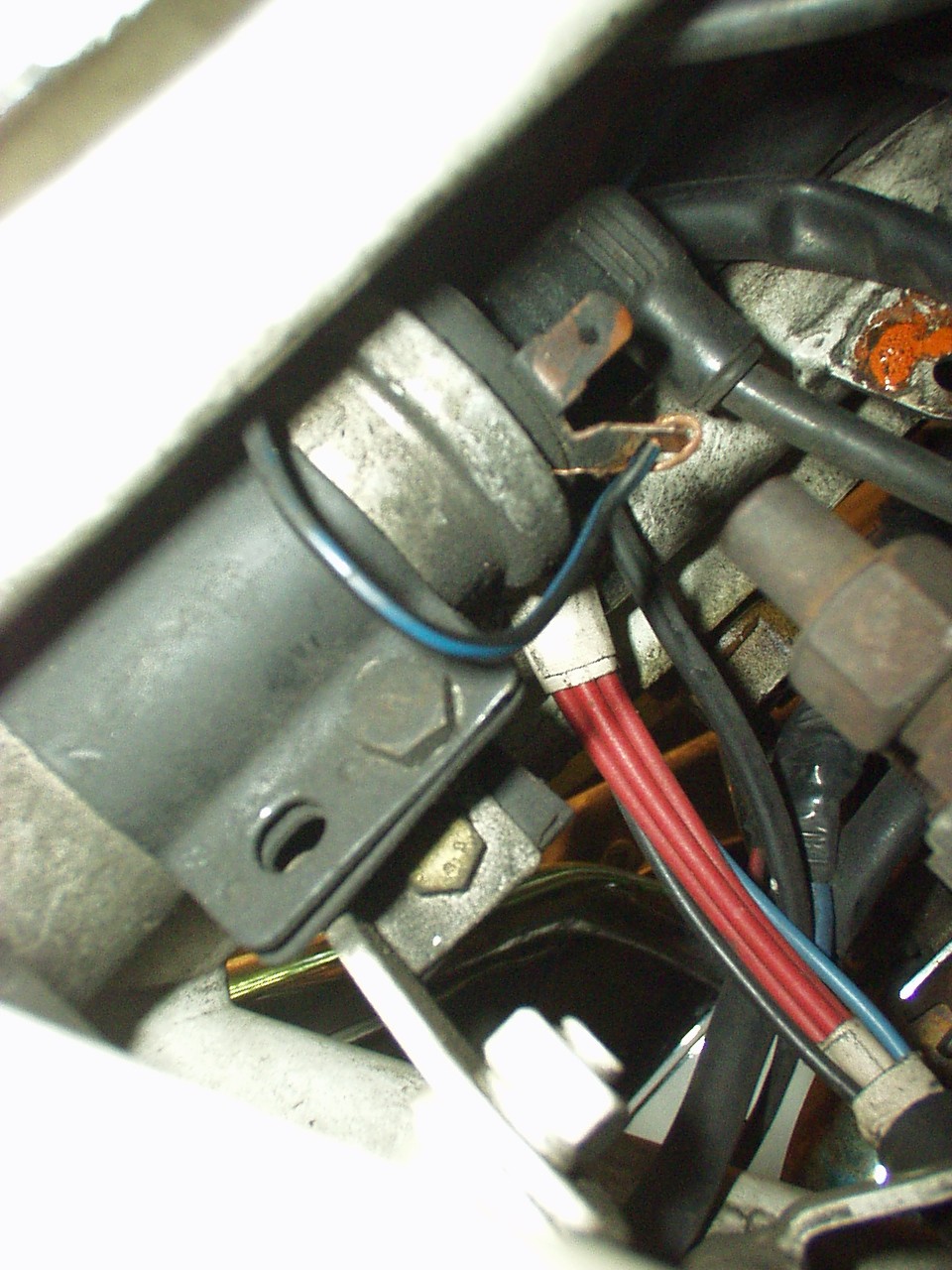 Zunächst Kerzenstecker abziehen und das Kabel an den Motor halten und starten. Keine Funken. Die Maschine hat eine kontaktlose Zündung von Lucas, ja, ja, normalerweise funktioniert sie auch im Dunkeln (Sprüche über die Queen of Darkness gibt es genug). Wenn die jetzt hinüber ist, kann ich mich nur abschleppen lassen. Ich wollte schon über mein Nokia-Brikett den ACE anrufen, da kam mir die Erleuchtung. Unter dem Tank liegen die beiden Zündspulen, die hier in Reihe geschaltet sind. Das hat übrigens zur Folge, dass jede Kerze nicht nur - wie üblich - einmal während zweier Kurbelwellenumdrehungen zündet, sondern zweimal. Das zweite Mal aber einfach nur so ohne eine Verpuffung auszulösen.