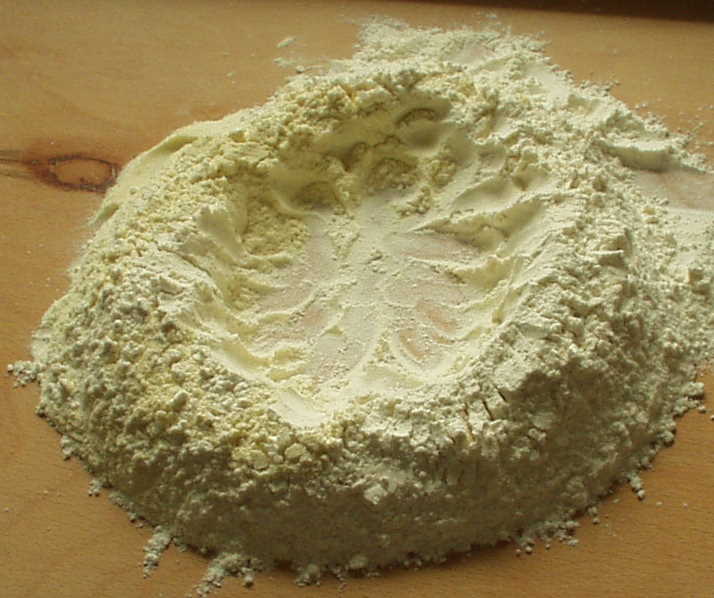 Mehl oder Grieß auf dem Tisch verteilen und eine Art Vulkan