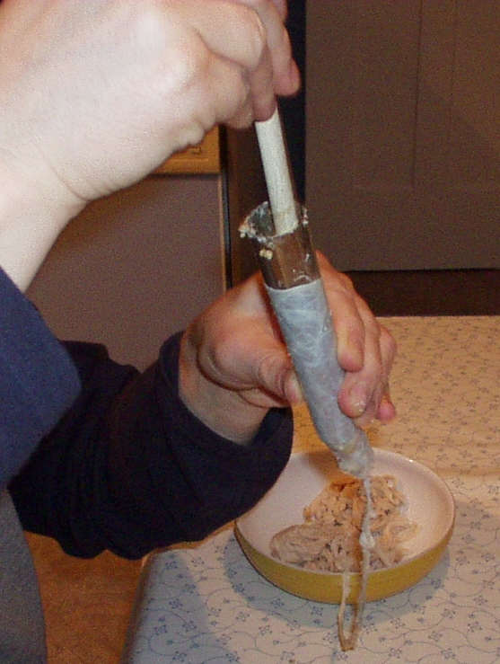 gefüllt und mit einem Holzlöffel in den Darm gestopft. Nicht